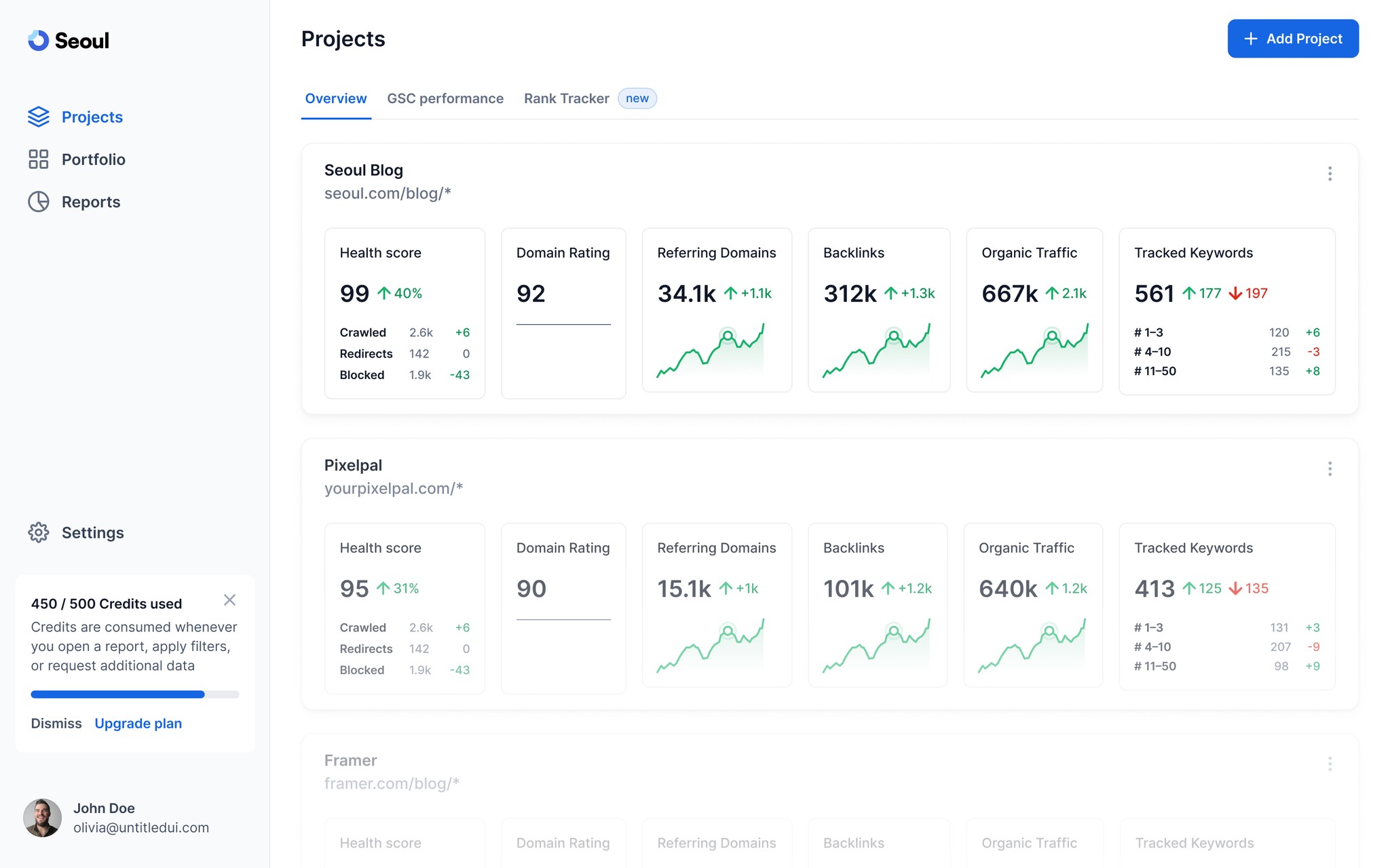 لیستی از URLهای هدف را در یک پورتفولیو تجمیع کنید و نمای کاملی از شاخصهای جمعآوریشده آنها دریافت کنید – ترافیک ارگانیک، کلمات کلیدی ارگانیک، بکلینکها، دامنههای ارجاعدهنده.